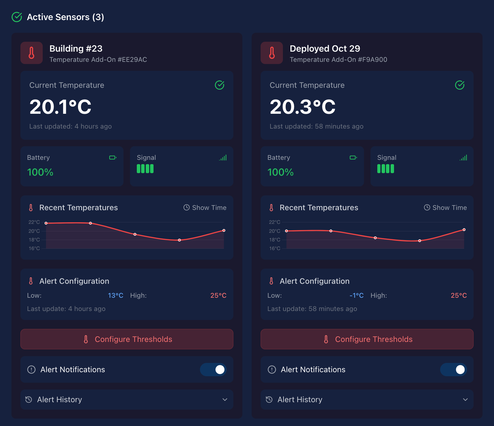 You can view the most recent temperature reading, battery status, signal strength and past 24hrs of data from your dashboard.